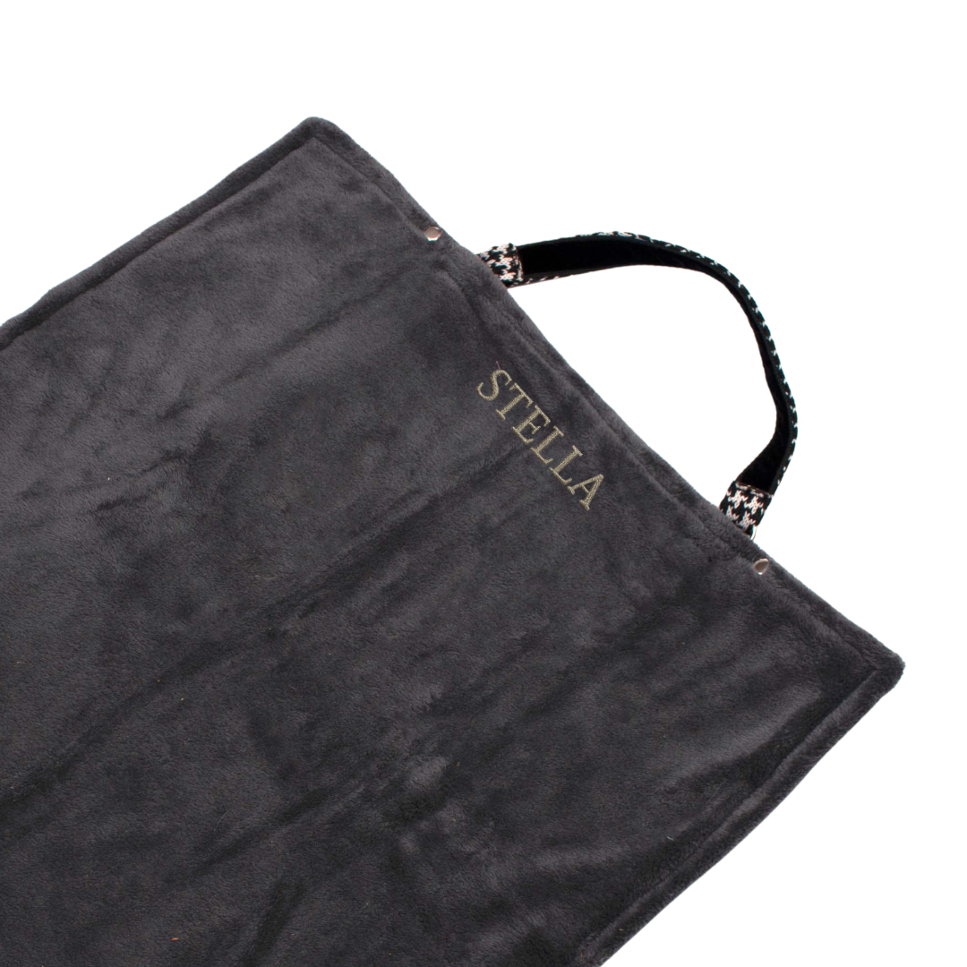 Enhance your pup's social experience with our Travel Place Mat. Made from waxed cotton and luxuriously soft fleece, your dog will finally have a comfortable spot to lie on. The convenient pockets on both sides provide space for your essentials and the detachable shoulder strap not only makes it super easy to carry, but doubles as a short lead you can loop around a chair or table leg. Take the luxury one step further with a custom embroidery on the inside, a personal stamp on your dog's spot!