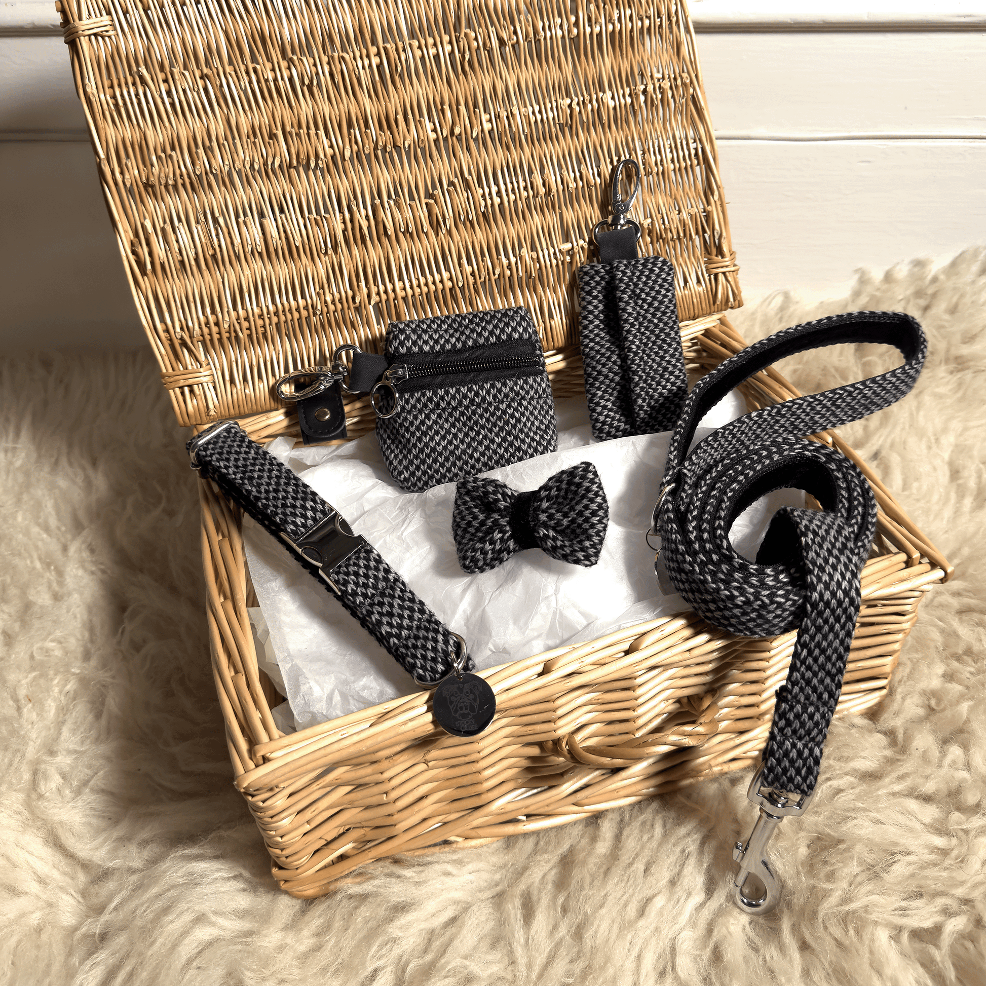 Give the perfect gift to your dog this Christmas with our new bespoke hampers! Featuring a quality, custom hamper and a range of handcrafted pieces in the Black & Grey design. Chic black & green yarns, Stainless Steel fittings and a custom finishes on the Bow Tie and Hamper it's the ultimate festive gift for your pup.