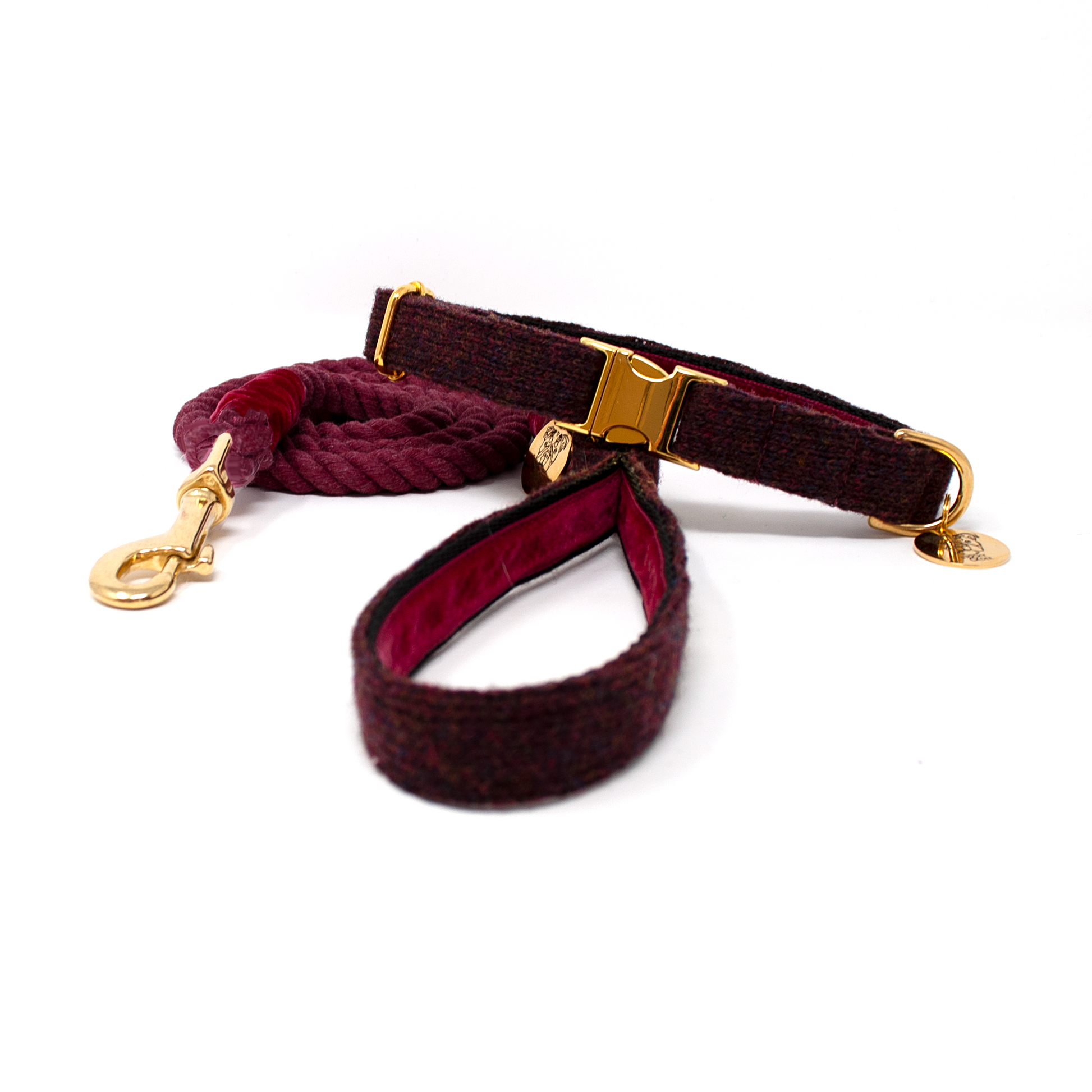 Handcrafted to order in the UK, the new Tundra design features a rich burgundy wool yarn and elegant gold fittings. Made with a luxuriously soft lining velvet and 100% premium wool, this Dog Collar offers exceptional comfort and timeless style for dogs of all breeds. Perfect for the pup who loves to stand out with understated sophistication.
