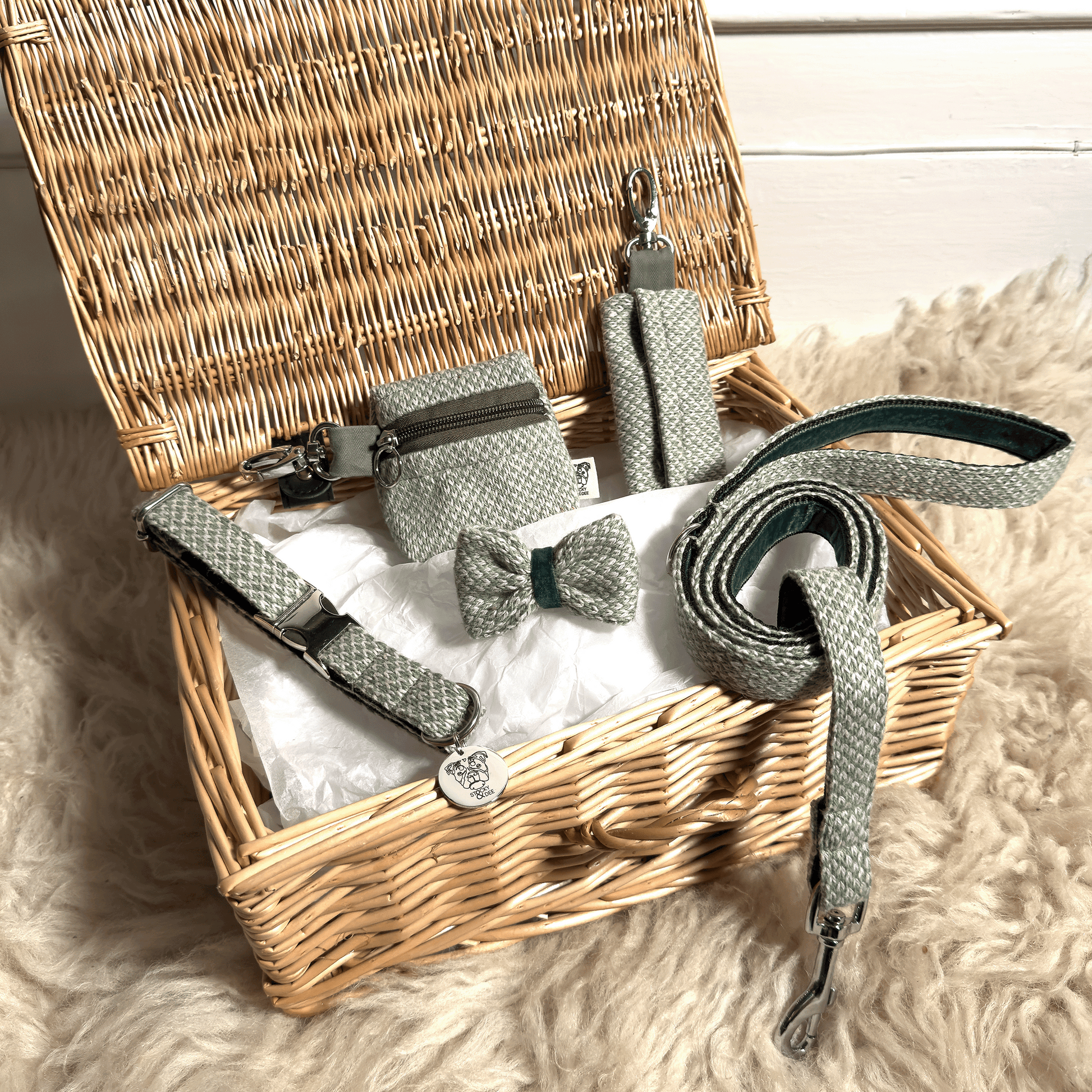 Give the perfect gift to your dog this Christmas with our new bespoke hampers! Featuring a quality, custom hamper and a range of handcrafted pieces in the Green & Dove design. A timeless green combo, Stainless Steel fittings and a custom finishes on the Bow Tie and Hamper it's the ultimate festive gift for your pup.