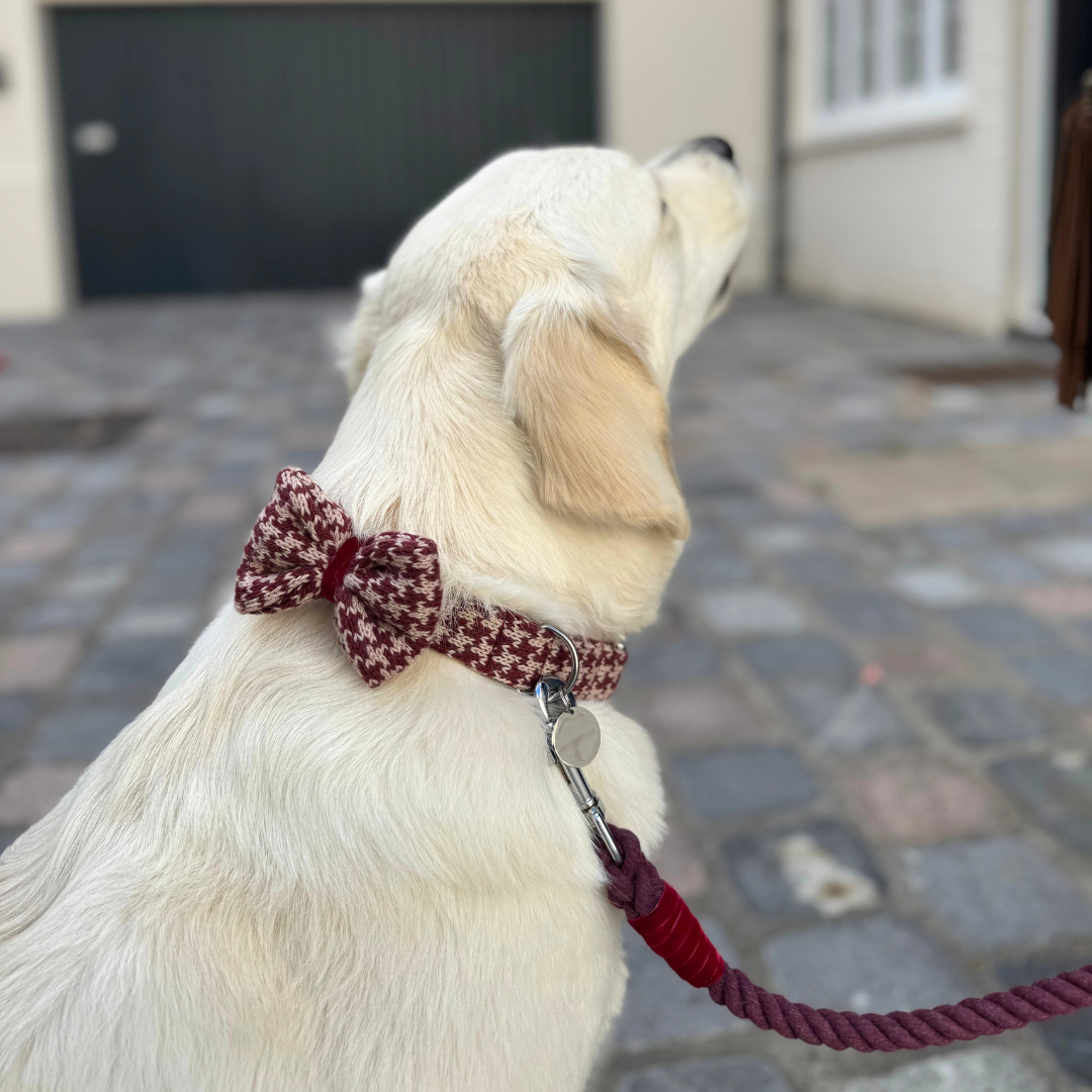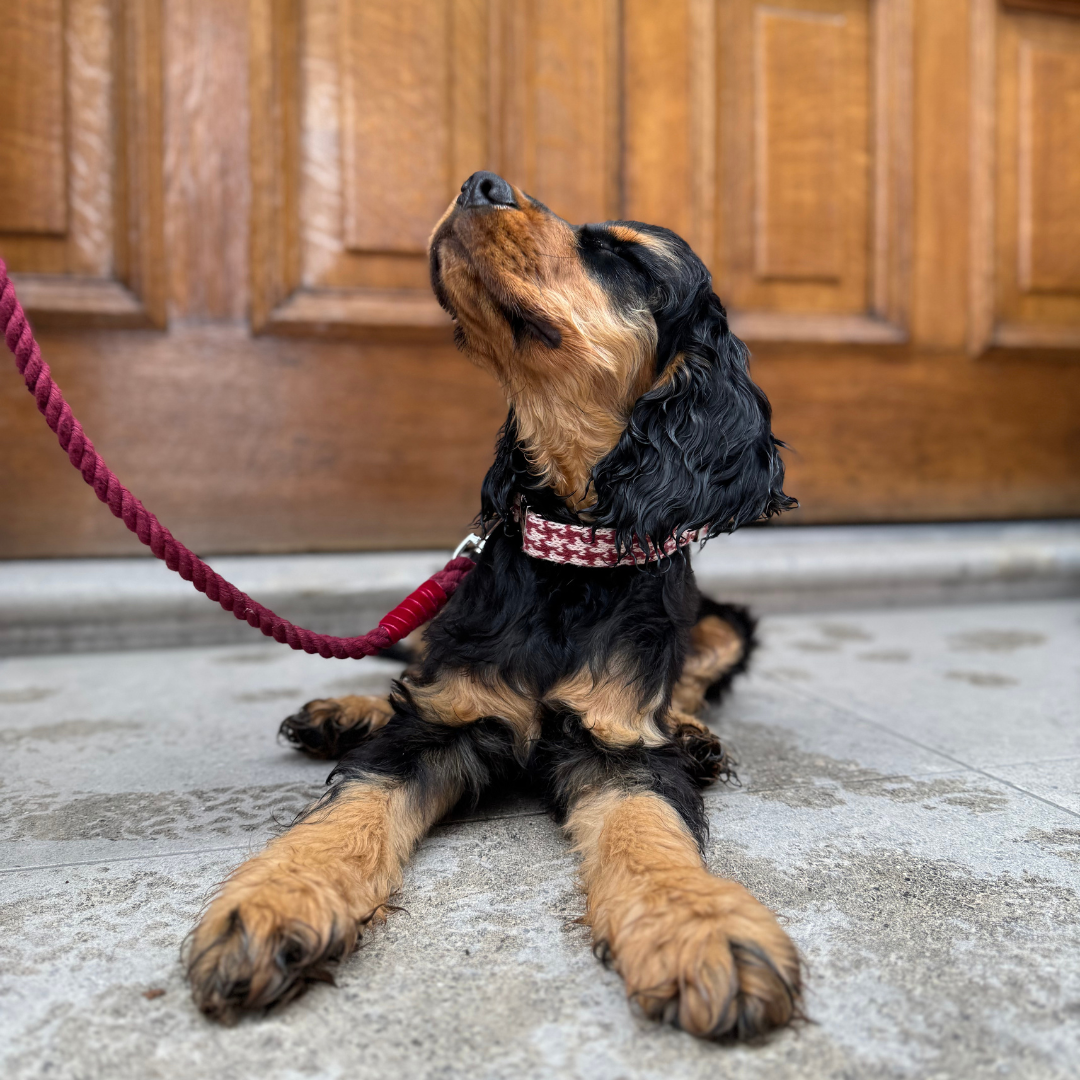 Experience the highest quality handcrafted dog collars, made to order in the UK. Created using luxurious velvet and merino lambswool yarn, this soft and elegant collar is perfect for any fashionable pup.